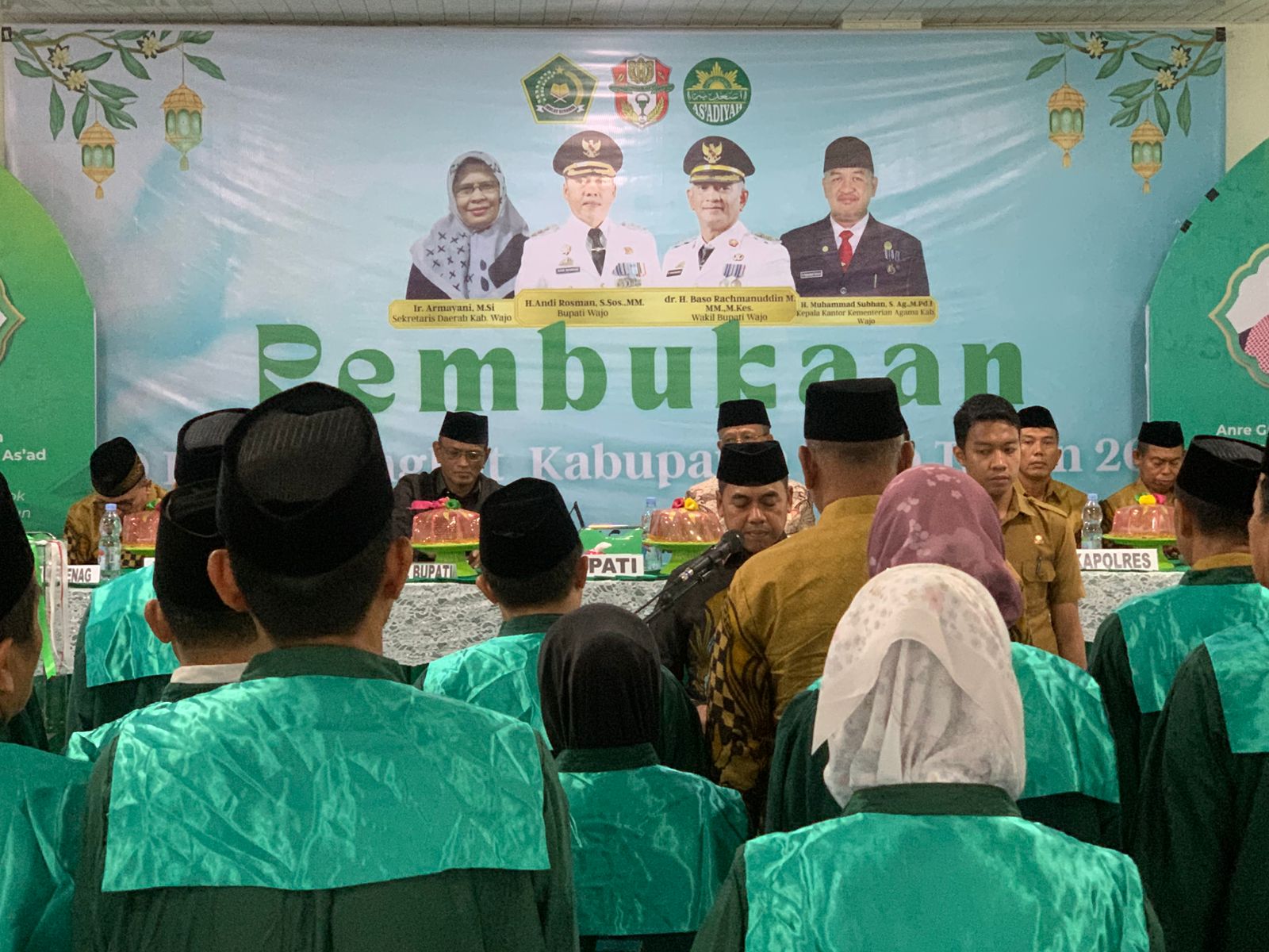 Bupati Wajo, Andi Rosman saat kukuhkan 29 Dewan Hakim dalam pembukaan Musabaqah Tilawatil Quran (MTQ) ke-35 tingkat Kabupaten Wajo di Aula Ponpes As'adiyah Lapongkoda, Senin (24/11/2025).