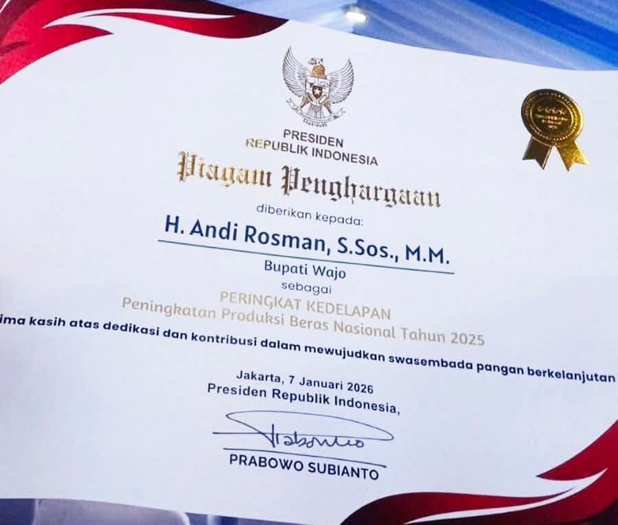 WAJO - Bupati Wajo, Andi Rosman diganjar penghargaan dari Presiden Republik Indonesia, Prabowo Subianto. Penghargaan tersebut diberikan Prabowo atas dedikasi dan kontribusi dalam mewujudkan Swasembada Pangan berkelanjutan. Bahkan, Kabupaten Wajo menempati peringkat kedelapan peningkatan produksi beras nasional...